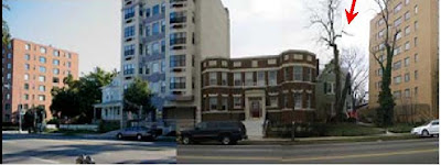 Previous developers at Hastings Development had proposed a wholesale relocation of the house, from its Wisconsin Avenue location in Cleveland Park to a vacant lot at 3118 Quebec Place NW. A 2008 report from Hastings Development described the sad case of a home that had "lost its setting" and was "pressed between multifamily apartment buildings." Pictures illustrating this point depicted a forlorn two story house dwarfed on each side by looming monoliths and fronted by a hectic thoroughfare. Encroachment was gradual; to the south, an eight-story apartment building was constructed in 1958, and to the north, a (unsightly) seven-story building went up in the Eighties. In contrast, 3211 was a modest, two-story frame house, set back from the street with a small front yard.